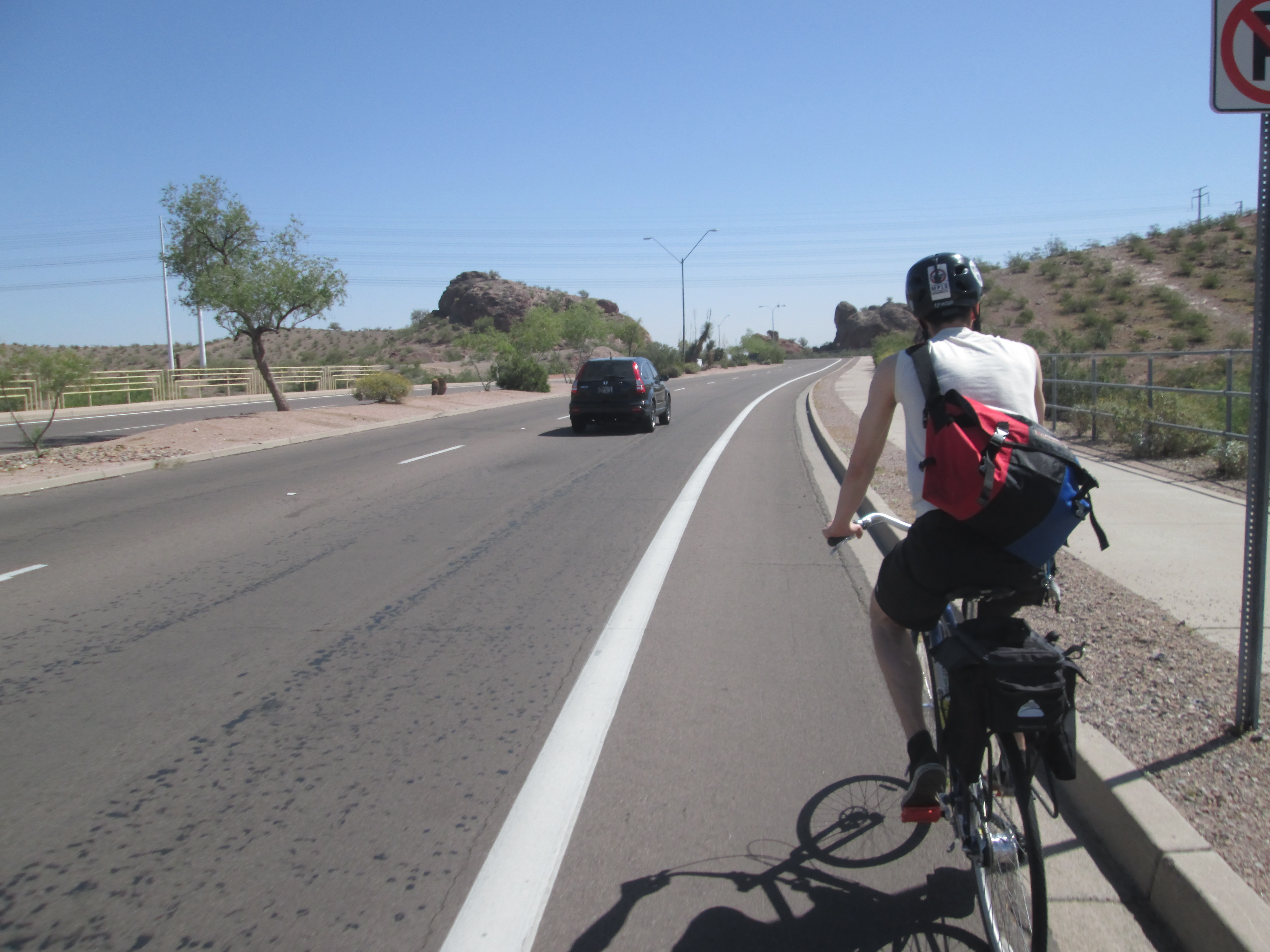 There were a lot of bicycle lanes in Phoenix as well, so it is not to be assumed that Phoenix is as backwards as the sidewalk law may suggest. The police just do not like large bikes on the road. But as Thomas pointed out, the driving lanes are very wide leaving ample space for bicyclists on the road. Thomas was obviously flabbergasted that the police claim he is “impeding the flow of traffic” by riding on the street. Coming from Portland, he knew this just was not true and that drivers are more than happy (usually) to pass you with plenty of space.